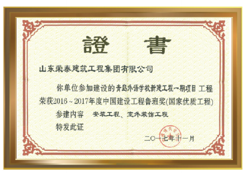 榮泰集團(tuán)以打造一流科技建設(shè)企業(yè)為目標(biāo),恪守“精心澆筑、真誠(chéng)服務(wù)、信守合同、鑄就品牌”的質(zhì)量理念,踐行“客戶至上、微笑服務(wù)”的服務(wù)宗旨,落實(shí)安全與質(zhì)量主體責(zé)任,強(qiáng)化工程全過程管理,精心組織施工,集團(tuán)多次被評(píng)為“質(zhì)量信的過單位”,參建的“山東省青島第九中學(xué)(青島外語(yǔ)學(xué)校)新建工程一期項(xiàng)目”獲得“2016~2017建設(shè)工程魯班獎(jiǎng)”,承建項(xiàng)目連續(xù)多年獲“泰山杯”“青島杯”、山東省建筑施工安全文明標(biāo)準(zhǔn)化優(yōu)良工地、青島市房屋建筑優(yōu)質(zhì)結(jié)構(gòu)工程獎(jiǎng)等省、市級(jí)榮譽(yù)稱號(hào)。