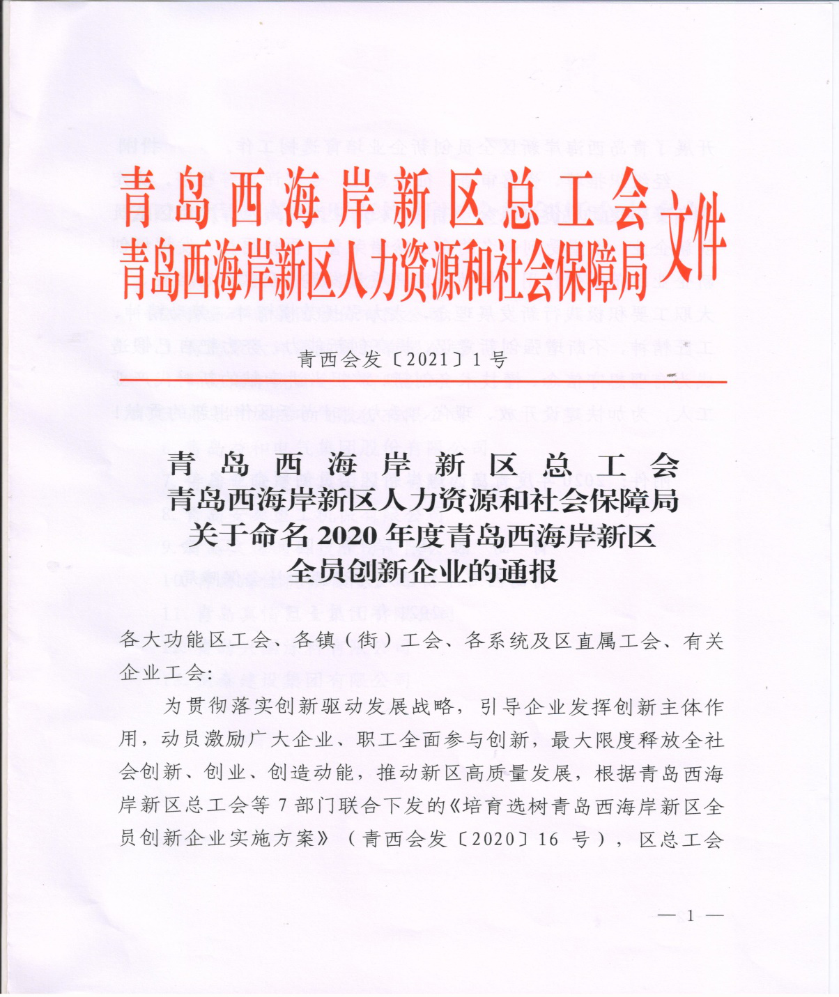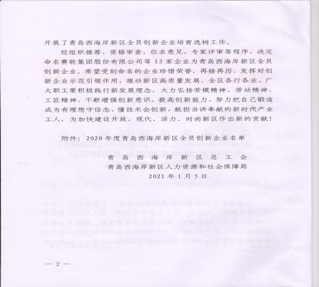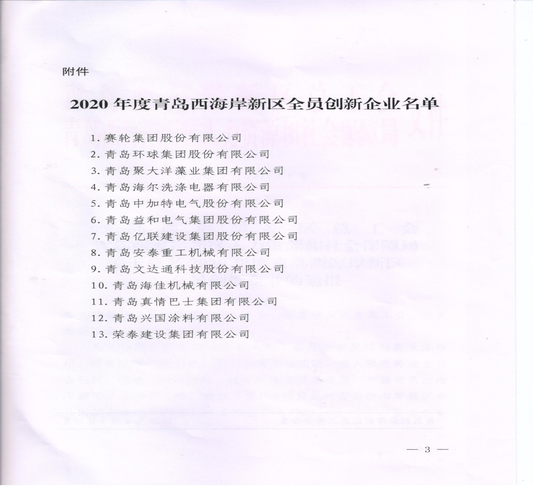 青島西海岸新區(qū)總工會(huì)、青島西海岸新區(qū)人力資源和社會(huì)保障局下發(fā)的《關(guān)于命名2020年度青島西海岸新區(qū)全員創(chuàng)新企業(yè)的通報(bào)》中,榮泰建設(shè)集團(tuán)有限公司位居“2020年度青島西海岸新區(qū)全員創(chuàng)新企業(yè)”名單之列,并獲得10萬(wàn)元鼓勵(lì)資金。