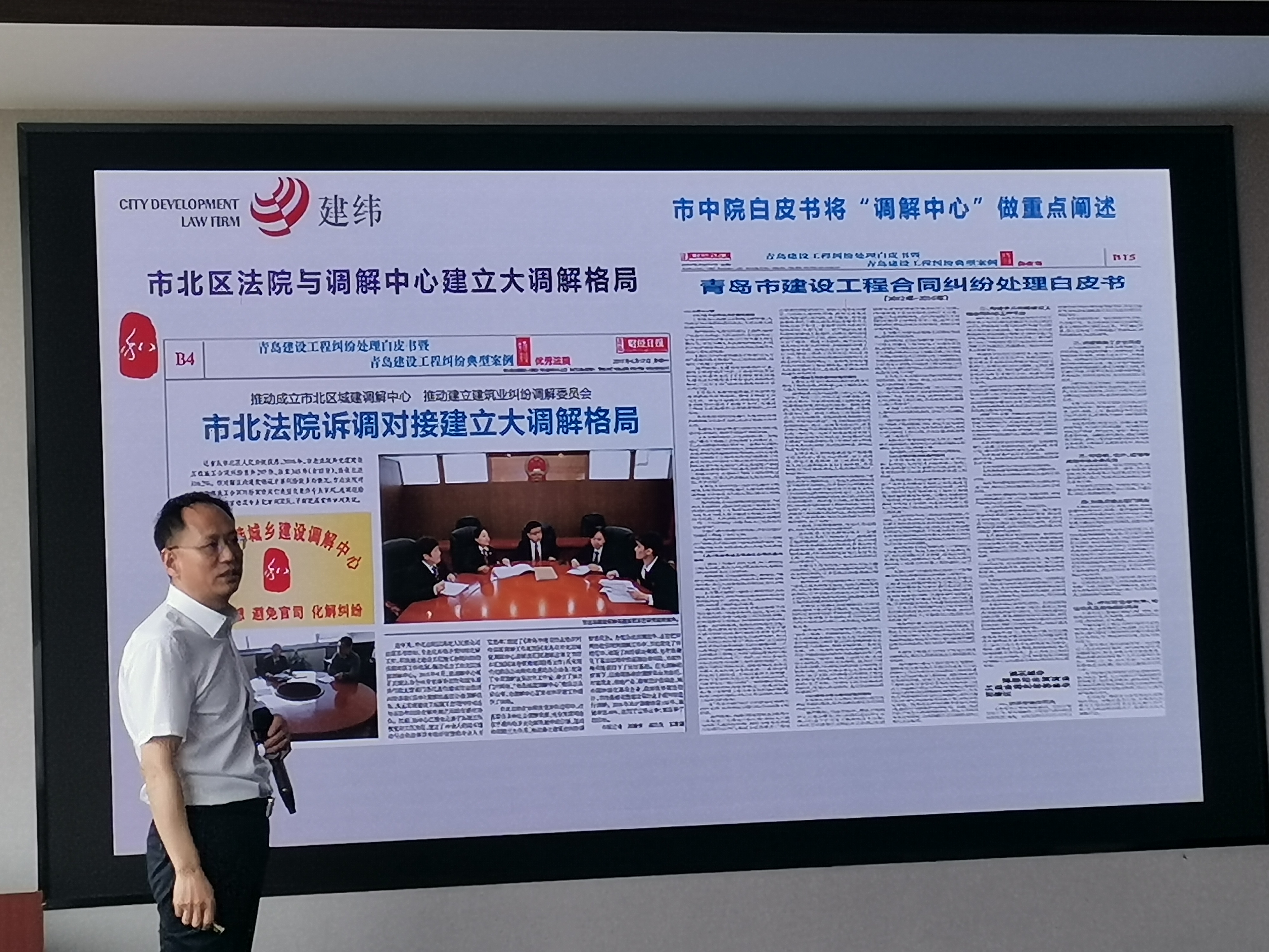 王樹友院長圍繞建筑工程糾紛的特點和解決方案,分享了《構建多元解紛機制,優(yōu)化法治營商環(huán)境》的課件,重點分享了仲裁對建設行業(yè)的特殊優(yōu)勢和這幾年的成功案例,提出了建設企業(yè)掌控法律風險、維護企業(yè)利益和商譽的預控和解決建議方案。薛鵬董事長和苗增剛輪值總裁對仲裁委和建緯調(diào)解中心蒞臨集團指導和交流表示歡迎和感謝,介紹了集團經(jīng)營和發(fā)展情況,共同探討研究了當前集團存在的工程糾紛案例,并表示將進一步加強與青島仲裁委員會建設工程仲裁院和建緯調(diào)解中心的交流學習與合作,規(guī)范和化解集團總包和分包合同糾紛風險,更加高效、快捷的解決工程糾紛,維護企業(yè)權益與商譽。