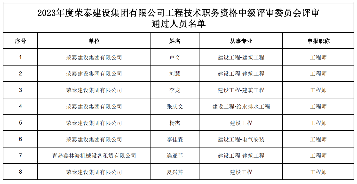 附件:2023年度榮泰建設集團有限公司工程技術職務資格中級評審委員會評審通過人員名單